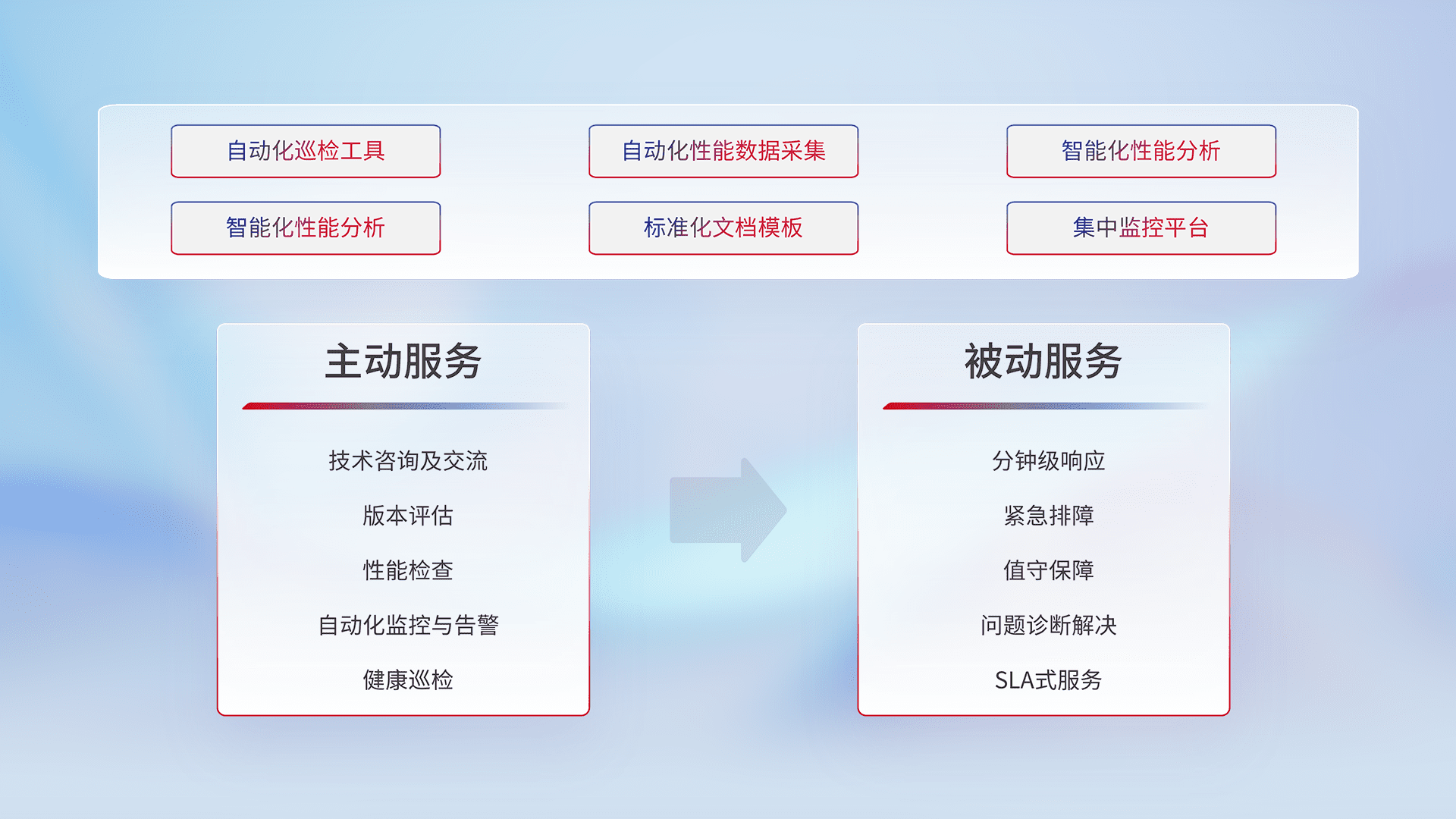 智能化工具和标准化文档,,,保障服务质量,,,,提供主动服务(包含技术咨询、、版本评估、、、、性能检查、、、自动化监控与告警、、健康巡检)和被动服务包含(分钟级响应、、紧急排障、、值守保障、、问题诊断解决、、、SLA服务)。。。。